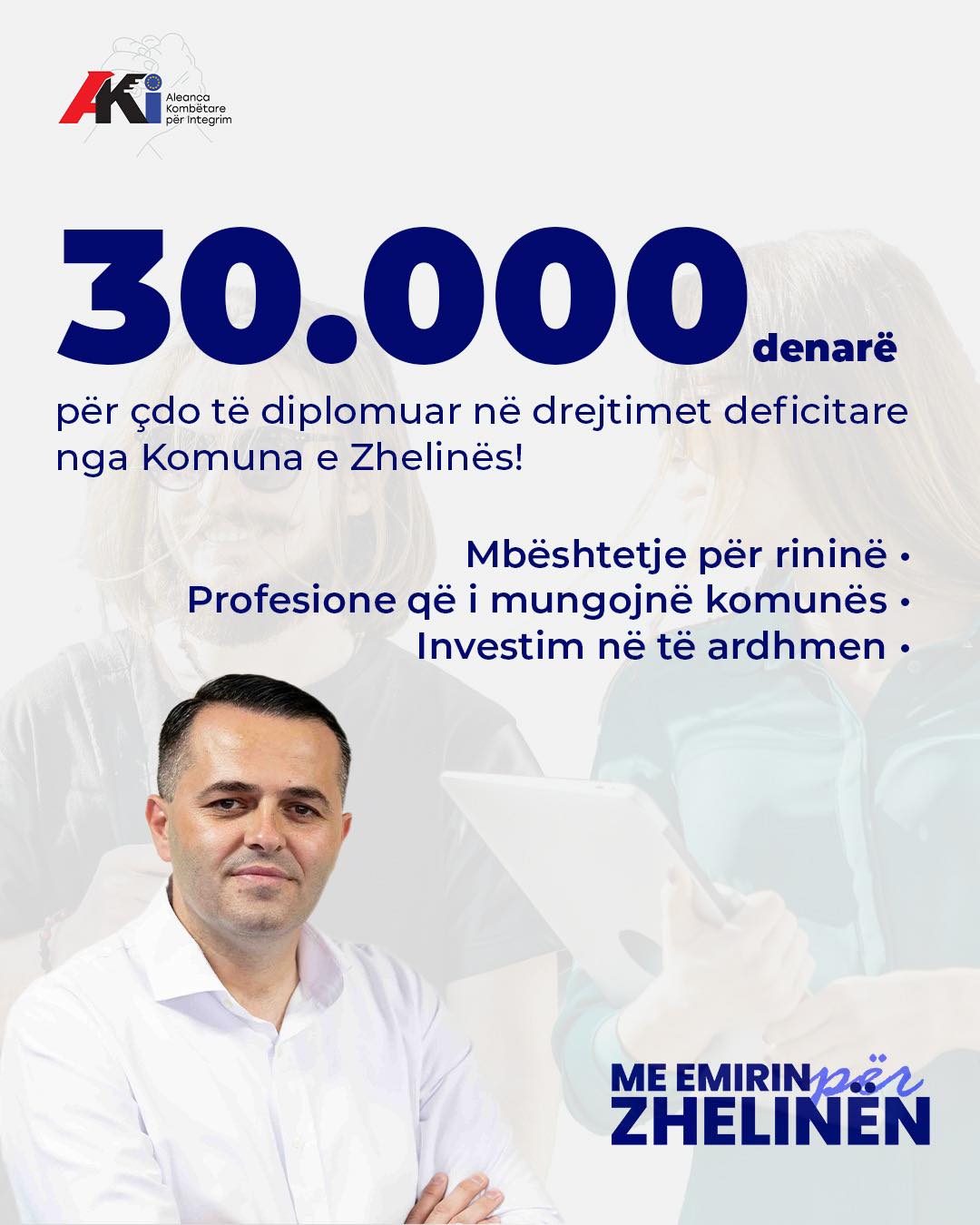 “Premtoj: 30.000 denarë shpërblim për çdo të diplomuar në drejtimet deficitare nga Komuna e Zhelinës!” – theksoi ai në postimin e tij.